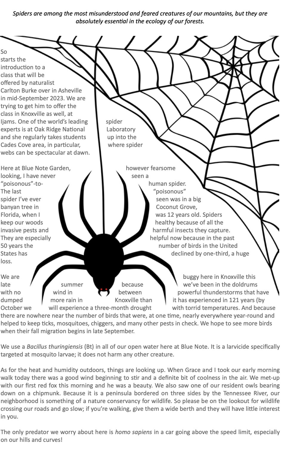 I’ve been in isolation at Blue Note Garden for ten months—six of those recovering from breast cancer surgery and chemotherapy—with growing appreciation for the world of nature that surrounds me here: