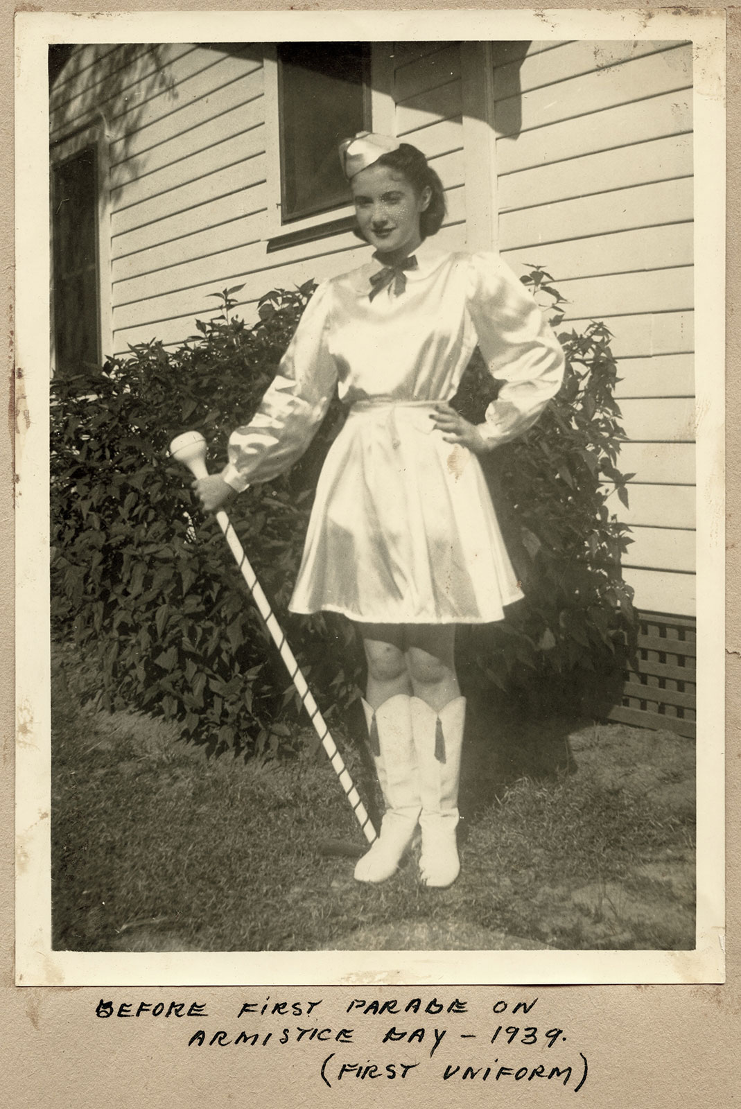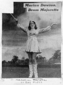 In August I joined the American Legion Auxiliary Juniors. I was appointed secretary to complete another girl’s term. At a meeting of the group late in August, there was an announcement of the formation of a Sons of the Legion drum and bugle corps, and it was stated that “Juniors” were eligible to join. The girls immediately thought that it meant to play instruments, and they were not interested. The advisor of the group suggested that I go to their first drill and offer my services. I did as she suggested, out of mere curiosity. I never dreamed that I was entering a very interesting adventure. I visited the first drill, which was held on a Sunday afternoon. Everything was complete confusion and someone handed me a baton. It all happened so quickly that I didn’t quite know what happened. The idea of being a majorette never entered my head, and I confess that I didn’t know one end of the baton from the other.