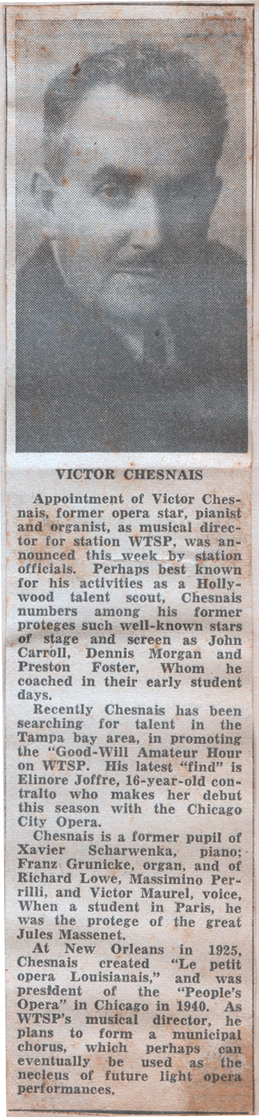 Mr. Victor Chesnais has just left for Tucson, Arizona. I was blessed in meeting this person as his vocal teachings and encouragements have been invaluable. I met Mr. Chesnais at the Maritime Training Station here in St. Petersburg toward the last of December, 1941. The event was a weekly quiz program, which was given at the training station by W.T.S.P. Every week, a guest artist would appear and I happened to be the guest artist this particular week. I phoned Sally U. Nelson, who was in charge, that I did not have an accompanist as I had broken relations with Mrs. Jones, my former accompanist. Sally said that she would have an accompanist for me. Meanwhile, in the Sunday “St. Petersburg Times” an article appeared announcing the arrival in the city of Mr. Victor Chesnais, world-renowned musician, singer, talent scout, and vocal teacher, and the article also stated that Mr. Chesnais would start an Amateur Hour over W.T.S.P. in order to discover talent in the Tampa Bay Area. I read the article carefully and wondered how in the world a person like this could ever come here. I never dreamed that I would ever meet him, let alone know him. You can imagine my surprise when I recognized the accompanist that Sally brought for me as the Mr. Chesnais whose picture I had seen in the paper. He accompanied me that night and I heard no more of him until I was summoned to appear on a street program which was called “a preview of the Amateur Hour.” After this appearance, I surmised that I would appear on the amateur hour, but that never happened. Mr. Chesnais became discouraged and discontinued the programs, as he could not find any real talent. Time went on and presently I was called for an interview with Mr. Chesnais. I sang for him and he took my name and address. On January nineteenth, I received a letter stating that Mr. Chesnais was settled and we could begin our lessons. I had casually mentioned to Sally that I would like Mr. Chesnais to coach me, but I didn’t believe that he would. I went up to the studio two nights a week at 6:30 P.M. for about a month. Then Mr. Chesnais advised that I try to get an old piano so that I could practice. I did this and then he decided that it would be better to come to the house to teach me. As I was going to school, we picked Saturday as the day for our lessons. I repeat, it is now the middle of August and Mr. Chesnais has been teaching me all these months, never missing a Saturday. I am very flattered to be the protégé of such a great person as he. I know that he has improved my voice a great deal, and he has taught me many things. I will be eternally grateful to him and shall never forget him. Before he left, he made me promise that I would come to Arizona soon so that he may help me in Hollywood. This is a great opportunity and if it is for the best, I intend to take advantage of it.