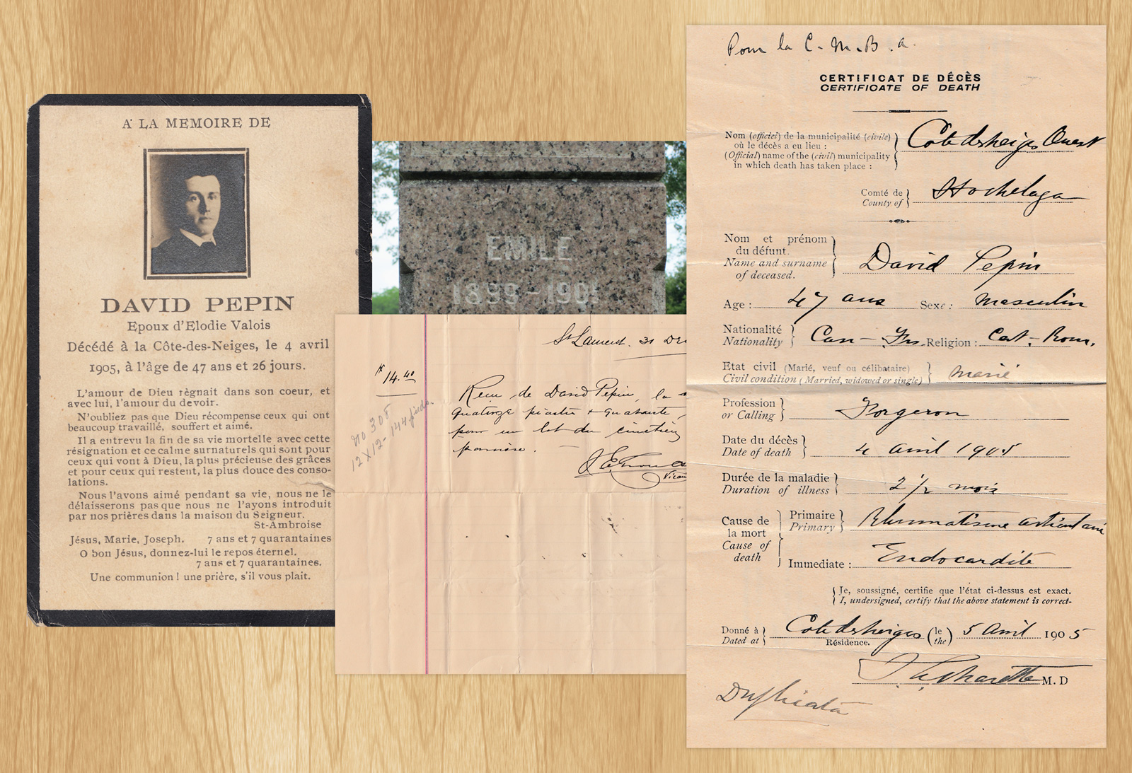 David purchased a family plot in the St. Laurent Cemetery at the time of the death of his 3-year-old son Emile in 1901. Many of the Pepin family are buried there, including Paul Emile in 1982.